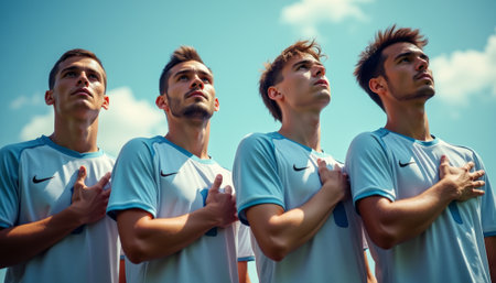 The image captures four determined young men in light blue soccer jerseys, standing in a row with their hands placed over their hearts, gazing upward against a bright blue sky. This powerful moment conveys a sense of unity, pride, and dedication, embodying the spirit of teamwork and sportsmanship.