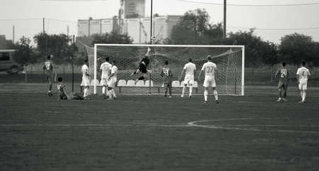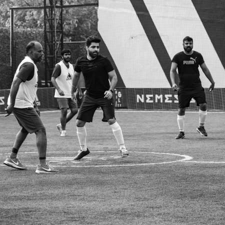 New Delhi, India - July 01 2018: Footballers of local football team during game in regional Derby championship on football pitch. Hot moment of football match on grass field stadium - Black and White