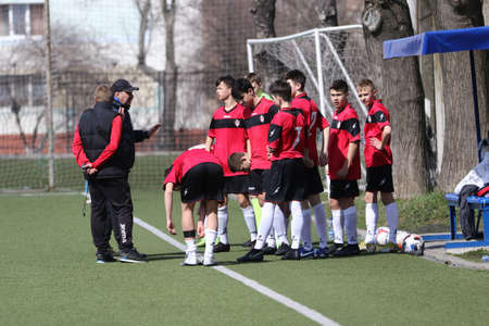 Odessa, Ukraine - April 7, 2021: Local children's football teams U-14 play on artificial grass of stadium. Football on field with artificial grass for soccer games. Children are playing football