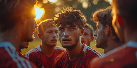 Football team huddle before match – unity, teamwork, motivation and sports spirit at sunset