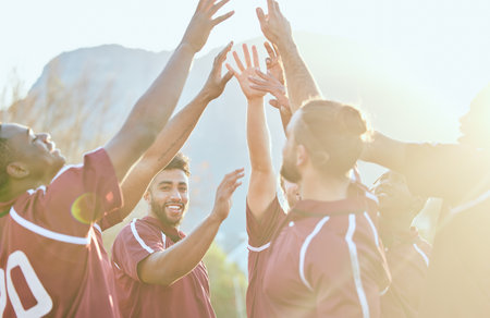 Raised hands, sports team celebration and excited rugby group solidarity, fitness support and celebrate game victory. Winner motivation, achievement and player smile together for competition teamwork