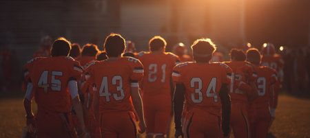 Five male football players huddle closely on a vibrant green field at sunset, demonstrating strong teamwork, unity, and sportsmanship in a stadium setting.
