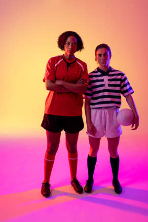 Portrait of two diverse female rugby players with rugby ball over neon pink lighting. Sport, movement, training and active lifestyle concept.