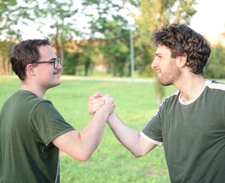 Two kids playing armwrestling in the park