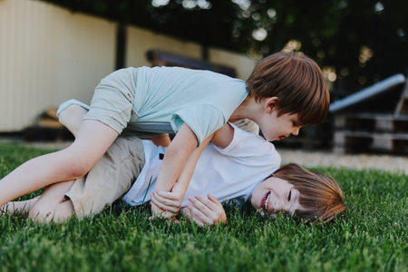 Two young boys playing joyfully in the grass, showcasing their energy and happiness in a sunny outdoor setting, perfect for family-themed content.
