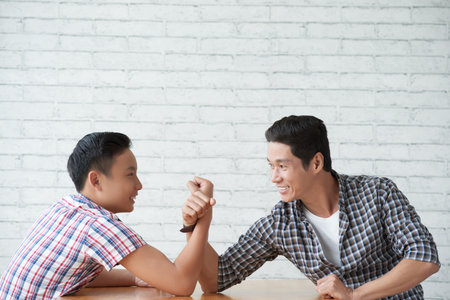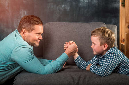 Funny family time. Happy father and son playing arm wrestle looking at each other. Dad and kid boy spending time together at home