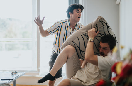 Friends laughing and having a playful pillow fight indoors