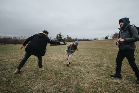 Three friends enjoying playful moments together in an open grassy field