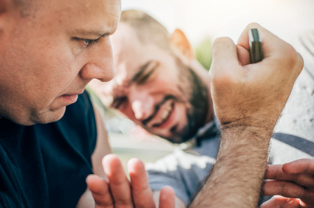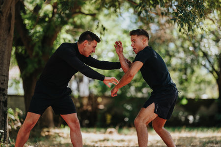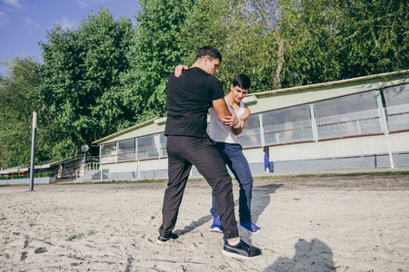 Kapap instructor demonstrates street fighting self defense technique against holds and grabs with his student