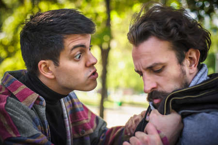 Two very angry, nervous and upset men in an aggressive and fierce quarrel conflict on the verge of a physical confrontation and a fight. Concept of male conflict