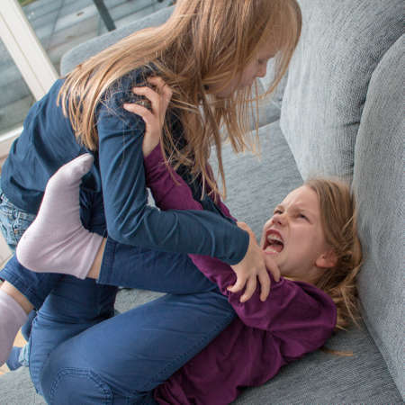 A 7- and a 9-year-old girl scream at each other and beat each other