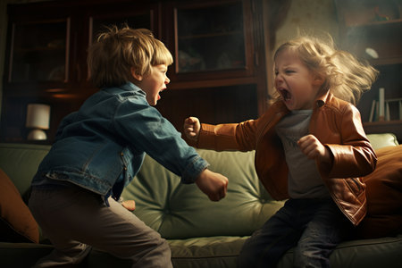 Two little children having fight at home. Kids fighting and screaming at each other. Siblings quarrel. Kids bad behavior. Generative AI.