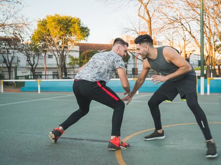 Portrait of two young friends playing basketball and having fun on court outdoors. Sports concept.