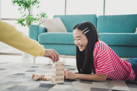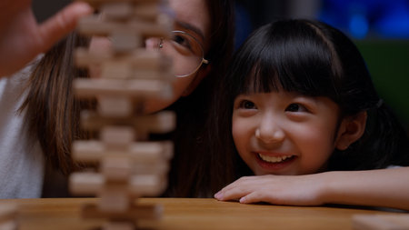 Happy asian family father and mother with little asian girl smiling playing with building tower from wooden blocks, taking tiles in turn from underneath until it falls, in moments good time at home