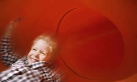 Boy slides down an red tube slide with motion blur.