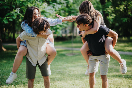 Happy friends playing piggyback outdoors at park on a sunny day