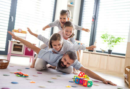Father with three daughters indoors at home, playing on floor.