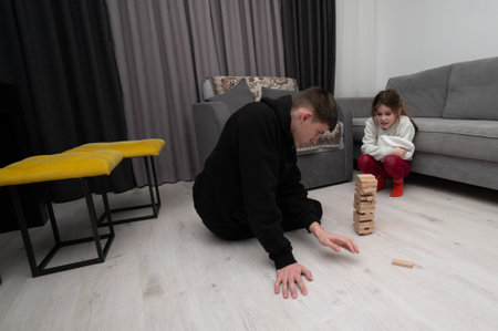 Family enjoying game of Jenga, with father engaging with daughters around table at home. Living room setting with cozy ambiance enhancing family bonding and fun