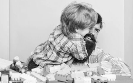 Child care concept. Happy family. Child development and upbringing. Father and son have fun. Bearded hipster and boy play together. Dad and child build plastic blocks. Importance of playing together