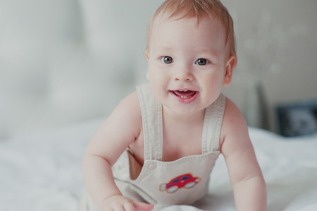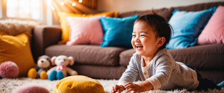 A happy baby is sitting and laughing with an open mouth in a cozy indoor setting. The scene features a neutral color palette, with soft natural light illuminating the child. The composition is suitable for various commercial uses, including advertisements, articles, or website content related to childhood and happiness.