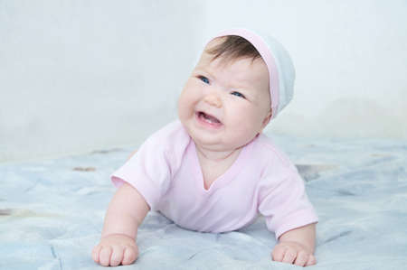 Sweet chubby cheeky baby lying on his tummy on the bed. Funny face expression.