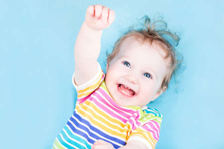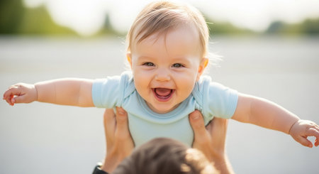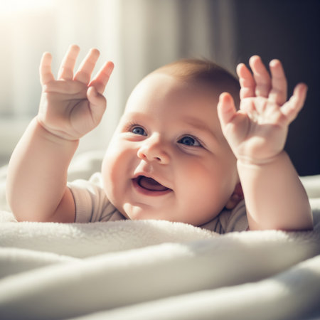 A baby is the central subject, with a wide smile and hands raised. The image showcases warm tones, with the baby's skin and clothing contrasting the blurred background. The composition highlights an expression of joy, with soft, natural lighting suggesting an indoor setting. Suitable for various editorial and commercial applications.