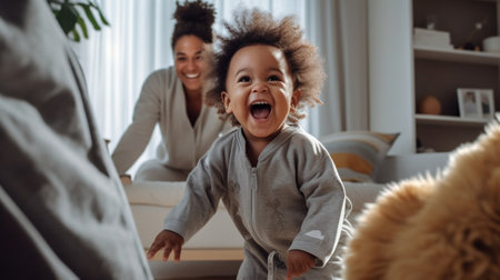 Generative AI : Playful african american mother trying to catch excited small child son while playing together at home playful mom and kid running and having fun in living room Hap