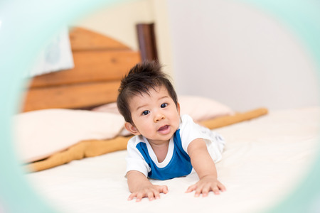 Adorable newborn kid during tummy time smiling happily at home.Portrait of cute smiling happy asian baby boy crawling on bed on the white blanket in bedroom.