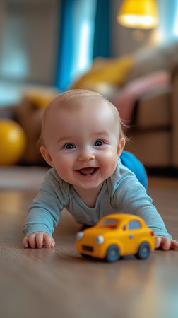 A joyful baby is crawling on the wooden floor, reaching out for a bright yellow toy car. Sunlight floods the cozy living room with soft furnishings in the background.