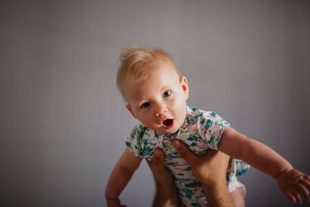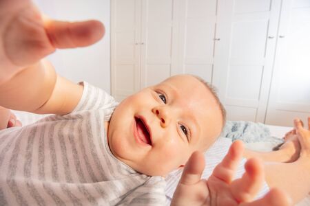 Cute laughing and googling little baby close-up portrait reaching with hands to camera