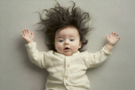 Child with striking messy hair lying on a soft blanket, looking up with a surprised expression. Childhood beginning