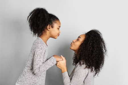 African american mother with her daughter holding hands and looking and looking at each other.