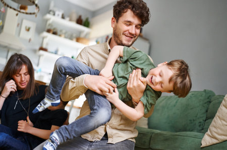happy family mother and father having fun with child son at home