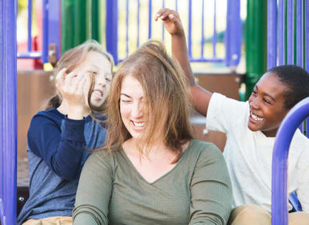 Silly children playing with hair of laughing woman