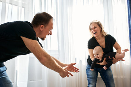 Mom and dad are playing with their little child in a bright room, all dressed in black t-shirts. Loving parents spend time with their child. Happy harmonious family.