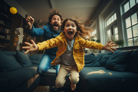 Parents and Child Jumping on Couch in Fresh Residence. Generative AI