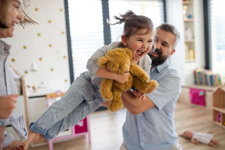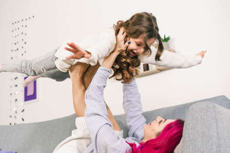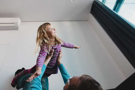 happy cute little girl flying in fathers arms in bedroom, single dad lifting cute little daughter