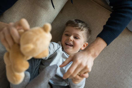 Upper view portrait of a balding caucasian father who is playing on the sofa with his small smiling son