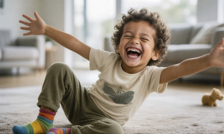 Portrait of cute little boy laughing while sitting on floor at home.Boy laughs heartily with arms wide open indoors.