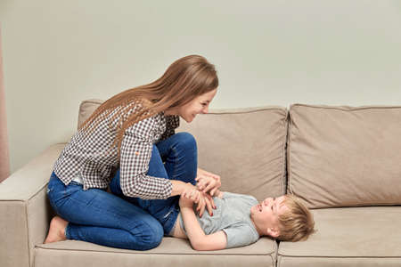 Mother playing with little son, mom enjoying the weekend time with preschool cheerful child, laughing together, sitting on the sofa at home, having fun, activities with the child at home.