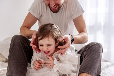 Father playfully holding his young daughter's head, causing her to laugh uncontrollably, showcasing a heartwarming moment of connection and joy between parent and child
