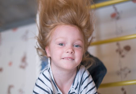 Portraits of happy child playing upside down outdoor in summer or spring park. Funny kid hold leg.