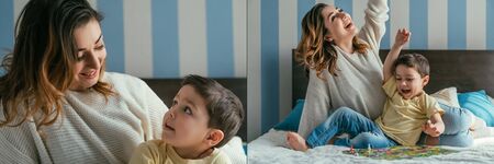 collage of mother and son showing winner gestures and looking at each other while playing board game on bed, horizontal image