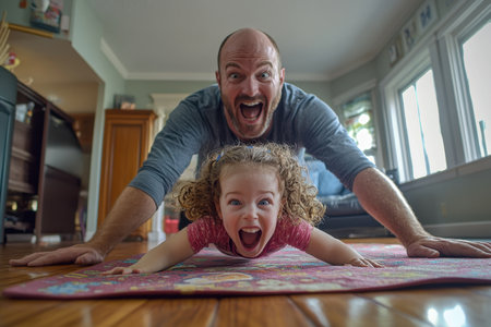 A man and his daughter engage in playful exercise on a colorful mat indoors. Both are smiling widely, showcasing a fun, energetic atmosphere in their cozy living room on a sunny afternoon.