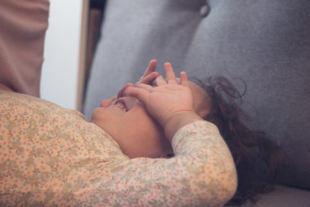 Playful girl playing peekaboo game. Tired small girl hiding face with her hands.