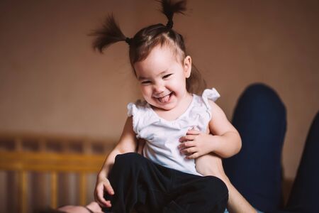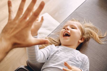 Father plays with little daughter 2-4 on bed. Dad tickles kids feet. Family having fun