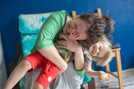 Young father having fun with song, playing and laughing at home. Happy family spending time together