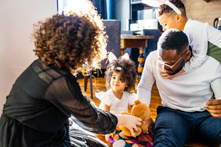 Happy young mixed race family spending time together in the living room.