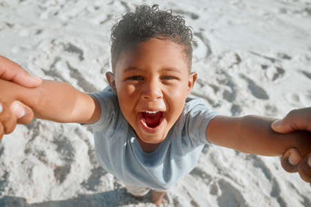 Excited little mixed race boy having fun while his father spins him around by the arms. Energetic son playing and spending time with parent while on holiday