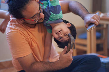 Father playing with young son in their sitting room at home. Young dad having fun with his children in holidays or weekend. Concept of parenthood, childhood, fathers day and family relationship.